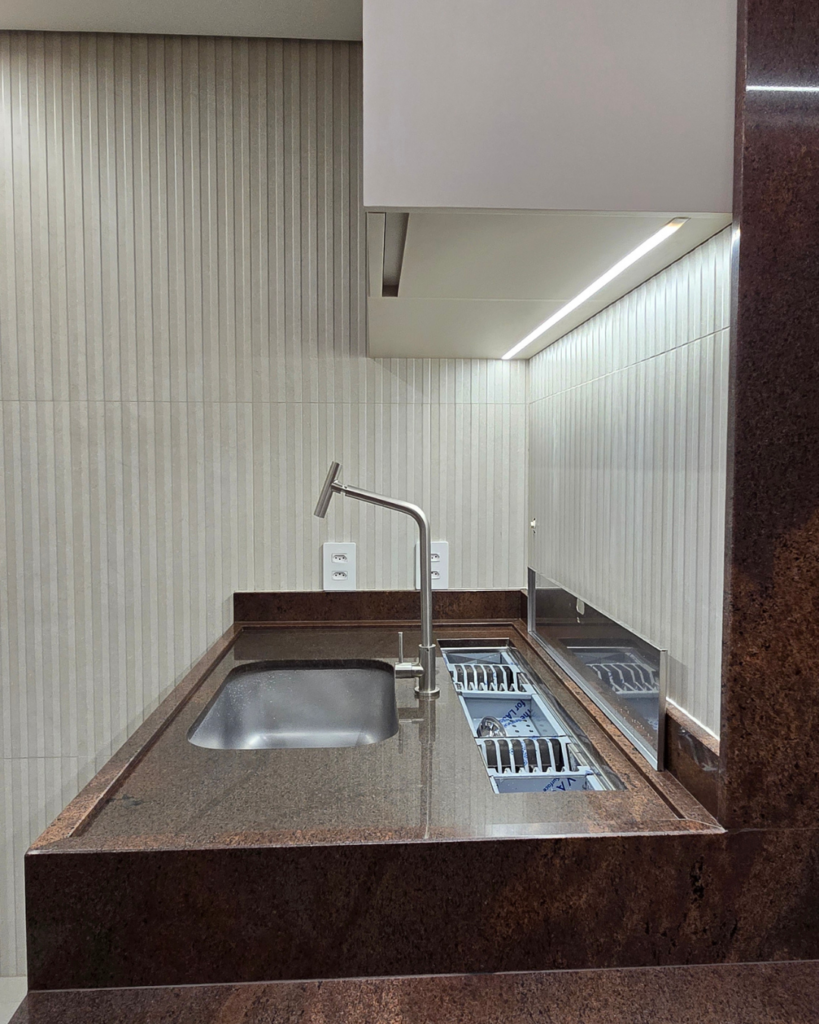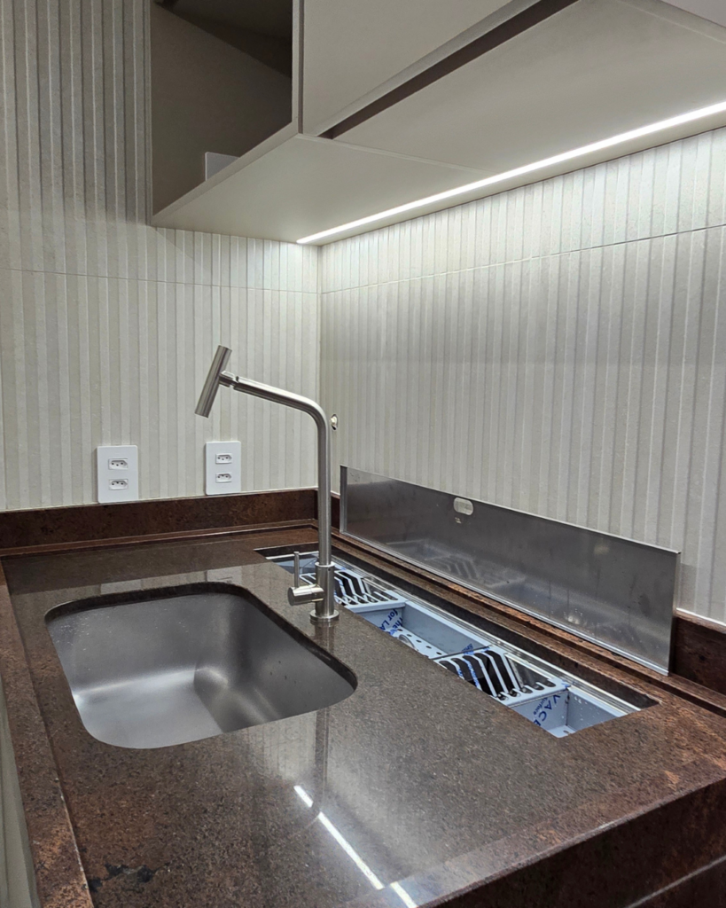 A calha úmida exige uma profundidade maior de bancada para ser instalada, e essa profundidade nós já tínhamos no projeto. O grande diferencial aqui foi a tampa: quando não está em uso, a calha fica completamente oculta, port-talheres, porta-pratos, suporte para copos, tudo escondido.