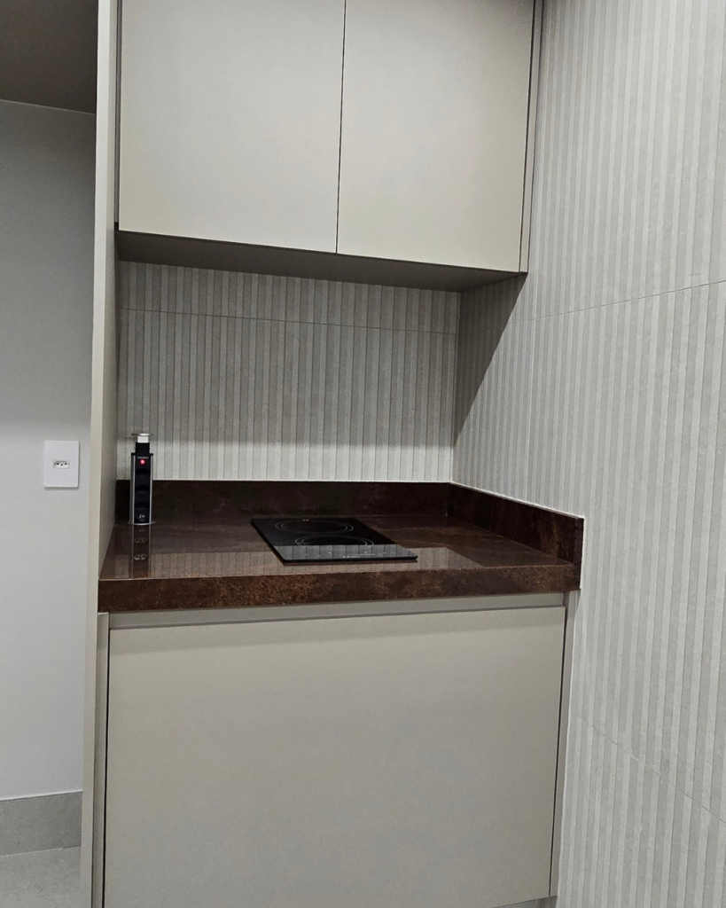 Neste projeto em Brasília, cada decisão foi tomada com intenção: a bancada que flutua, o piso que integra, o painel que camufla, a luz que cria atmosfera. Nada é acidente. Tudo é projeto.