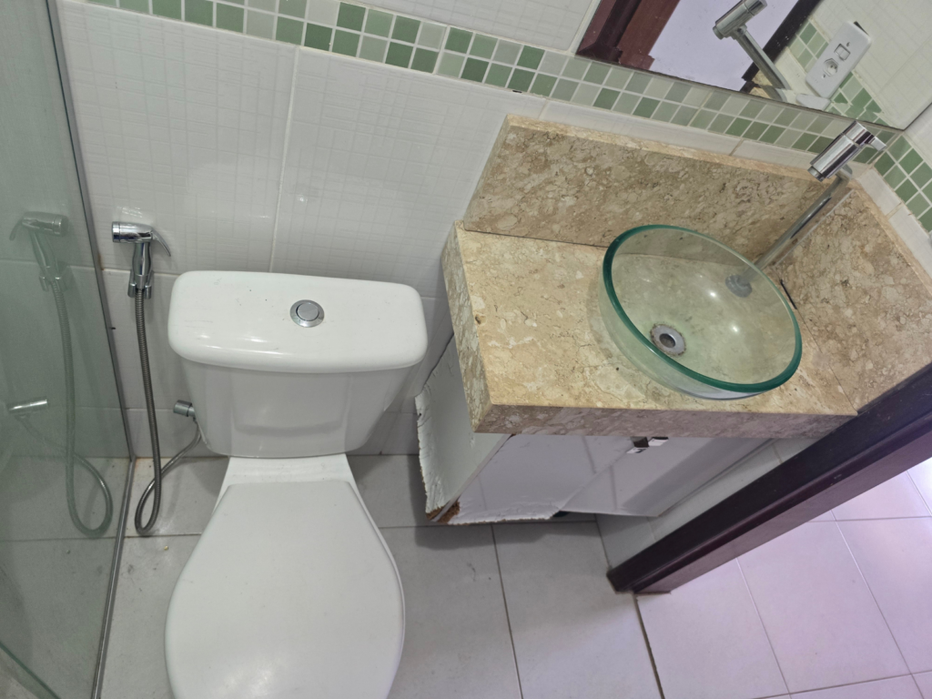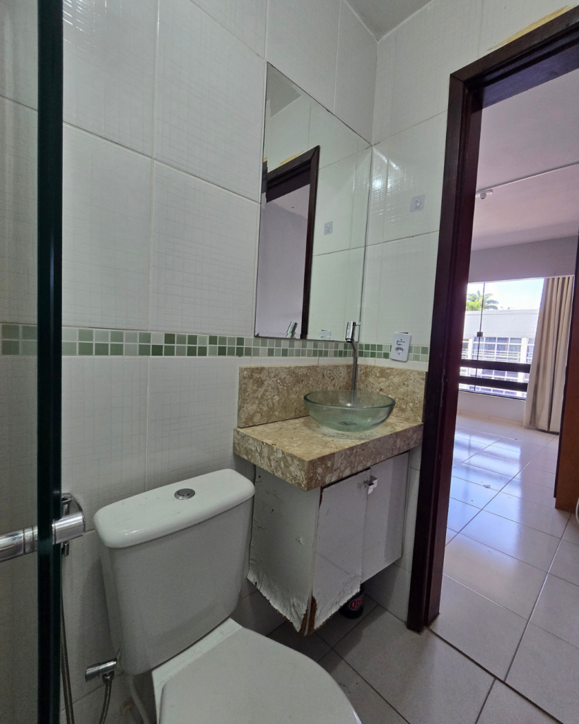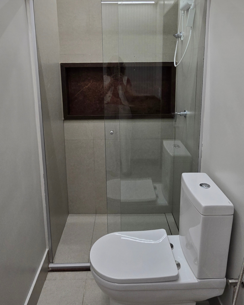 O banheiro original tinha box pequeno, porta no lado oposto e espaço mínimo para a cuba. Com a reformulação da planta, o ambiente ganhou uma proporção completamente diferente.