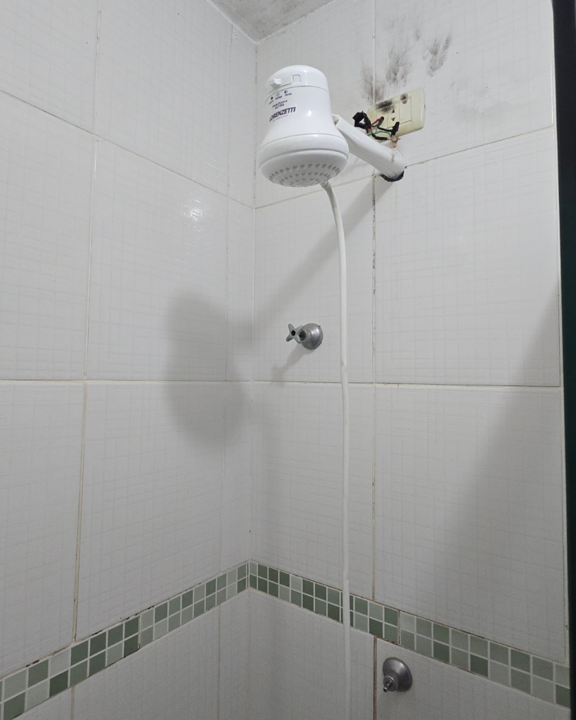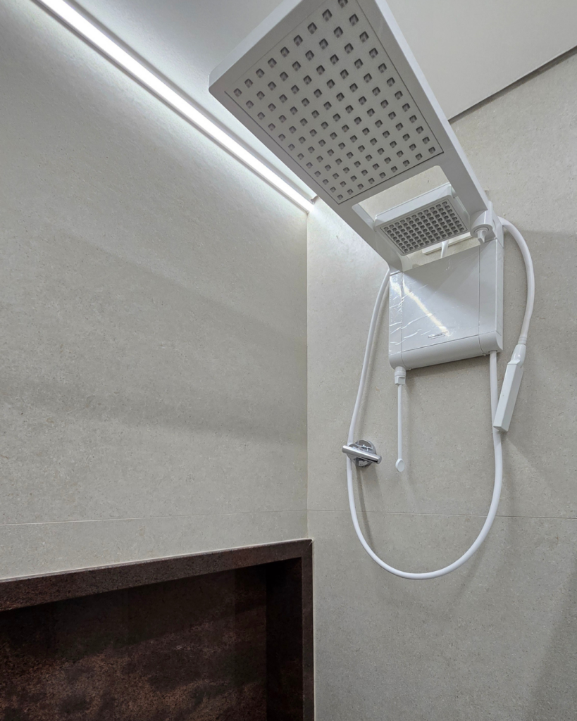 O resultado: nicho decorativo bem executado, box amplo e confortável, ducha higiênica, bancada com espelho e armário, parte com abertura basculante, tanto na parte superior quanto na inferior. Um banheiro que agora funciona de verdade.