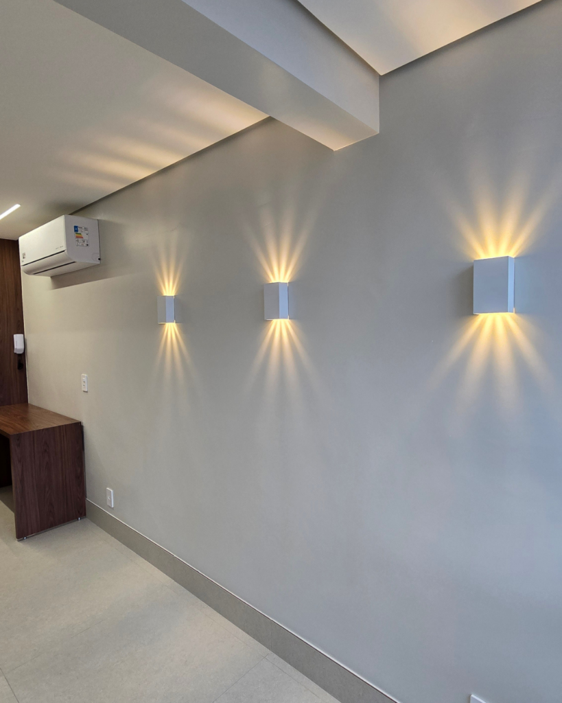No quarto, trabalhamos com três camadas de luz: a iluminação geral no teto (que dá amplitude), o perfil que serve o armário, e a luz indireta do cortineiro — aquela luz quente e aconchegante ideal para o final da tarde e a noite. A arandela de cabeceira tem dois focos independentes: um direcional e um de luz indireta.