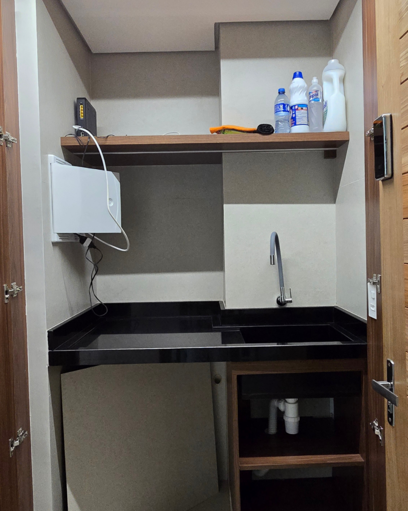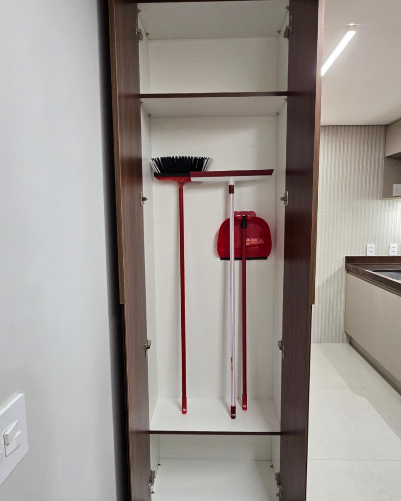Em apartamentos compactos, a lavanderia quase sempre é o ambiente que fica de fora do projeto, resolvido de qualquer jeito, sem atenção técnica ou estética. Aqui, não.