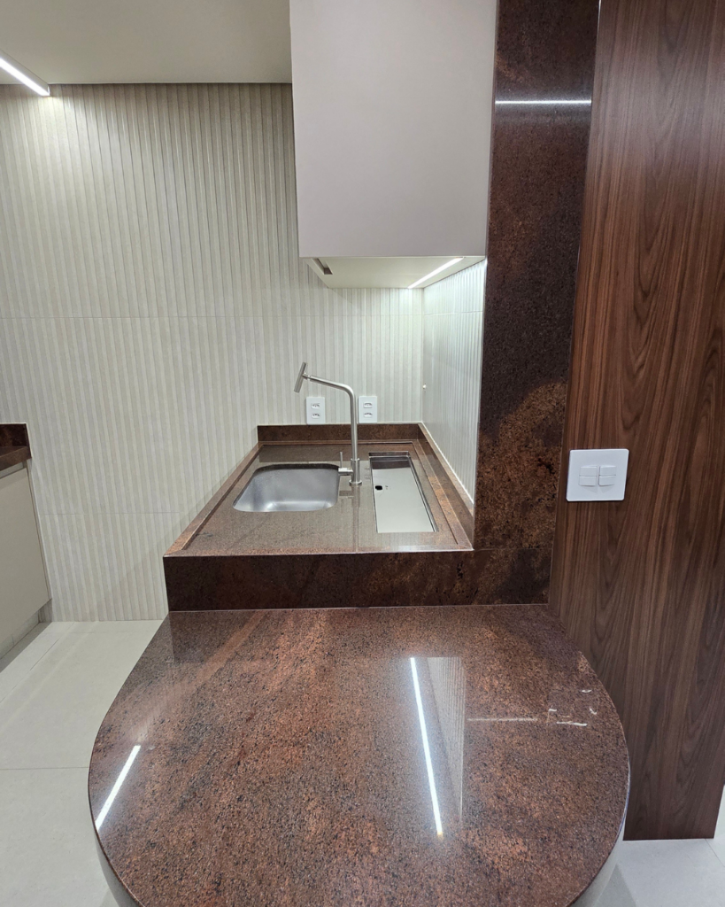 O acabamento em madeira foi a escolha que deu alma ao projeto. A combinação dessa madeira com a pedra da bancada criou uma elegância que vai além do funcional, é um projeto que tem personalidade visual forte e coerente.