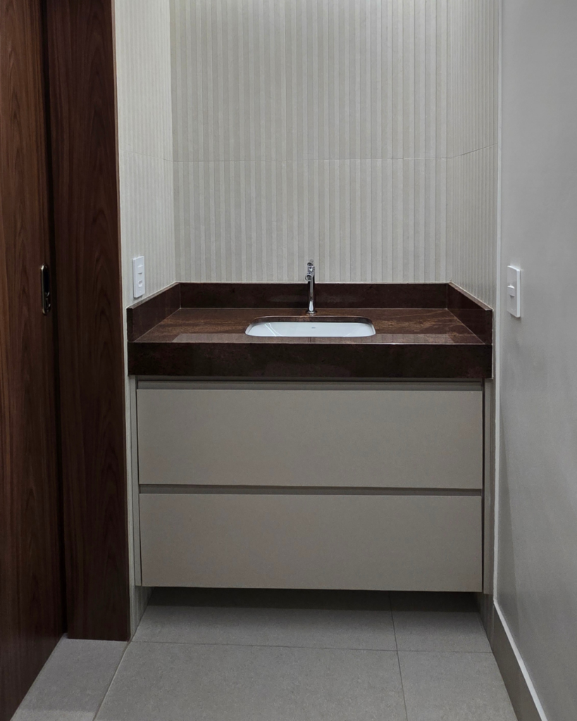 A lavanderia foi completamente integrada ao planejamento: um tanque com cuba esculpida (escolhido pela limitação de medidas do espaço), iluminação dedicada, armário de apoio bem na entrada e acabamento polido que conversa com o nicho aberto, um espelho colocado estrategicamente multiplica a percepção de espaço.