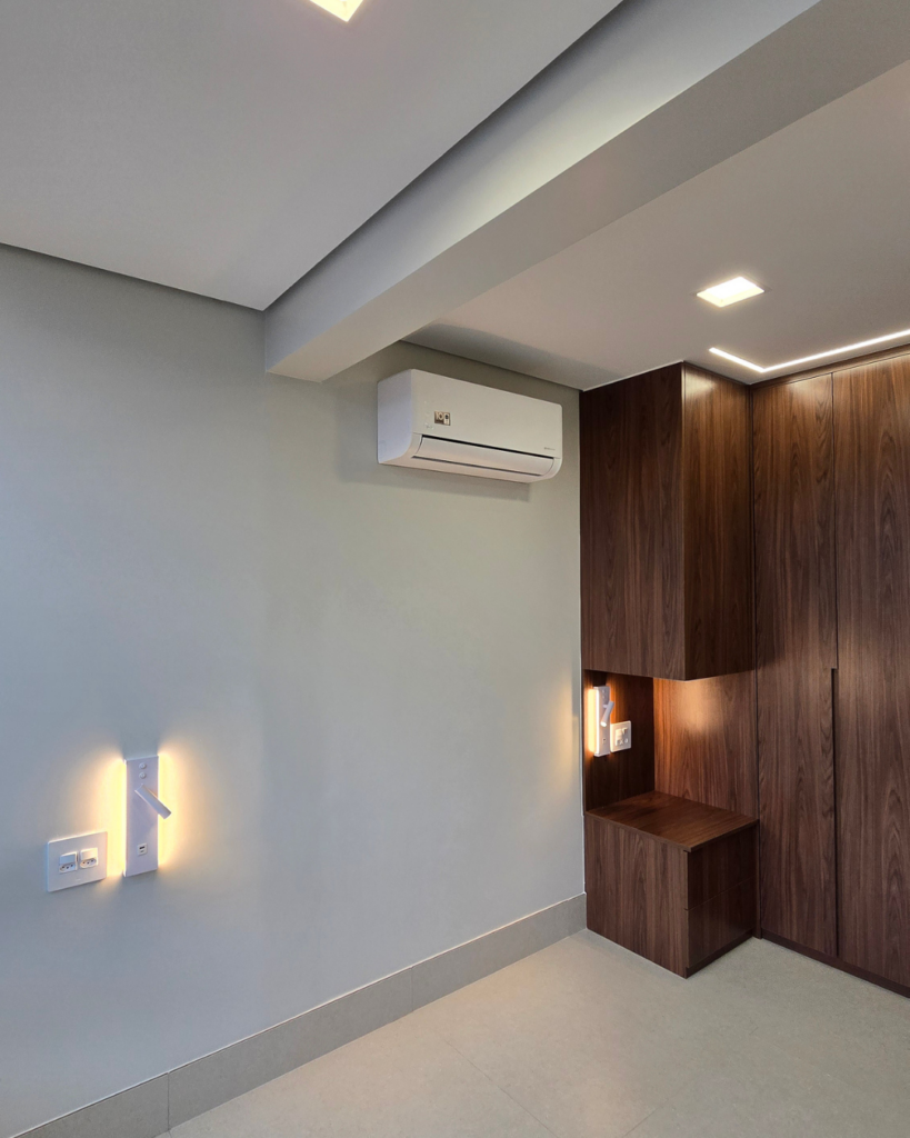O quarto foi projetado para ser completo sem ser excessivo. Além da cama de casal, o ambiente tem um armário de apoio de uso geral, espaço dedicado de trabalho com iluminação adequada e previsão para televisão, com toda a instalação elétrica embutida, sem necessidade de painéis externos.